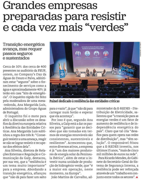 Segundo o Jornal de Notícia, o debate “Os desafios da Diretiva Europeia relativa à Resiliência das Entidades Críticas (REC)“, realizado no âmbito do Company’s Day 2025, reforçou a importância de garantir serviços de abastecimento de água cada vez mais seguros, preparados e alinhados com as exigências de sustentabilidade que marcam o futuro do setor.